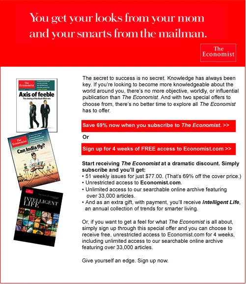 I was honored to have the opportunity to work on campaigns for The Economist, one of the most lauded, influential and informative business and political publications in the world. This particular email campaign targeted college students and recent graduates offering them significant savings on a yearly subscription.